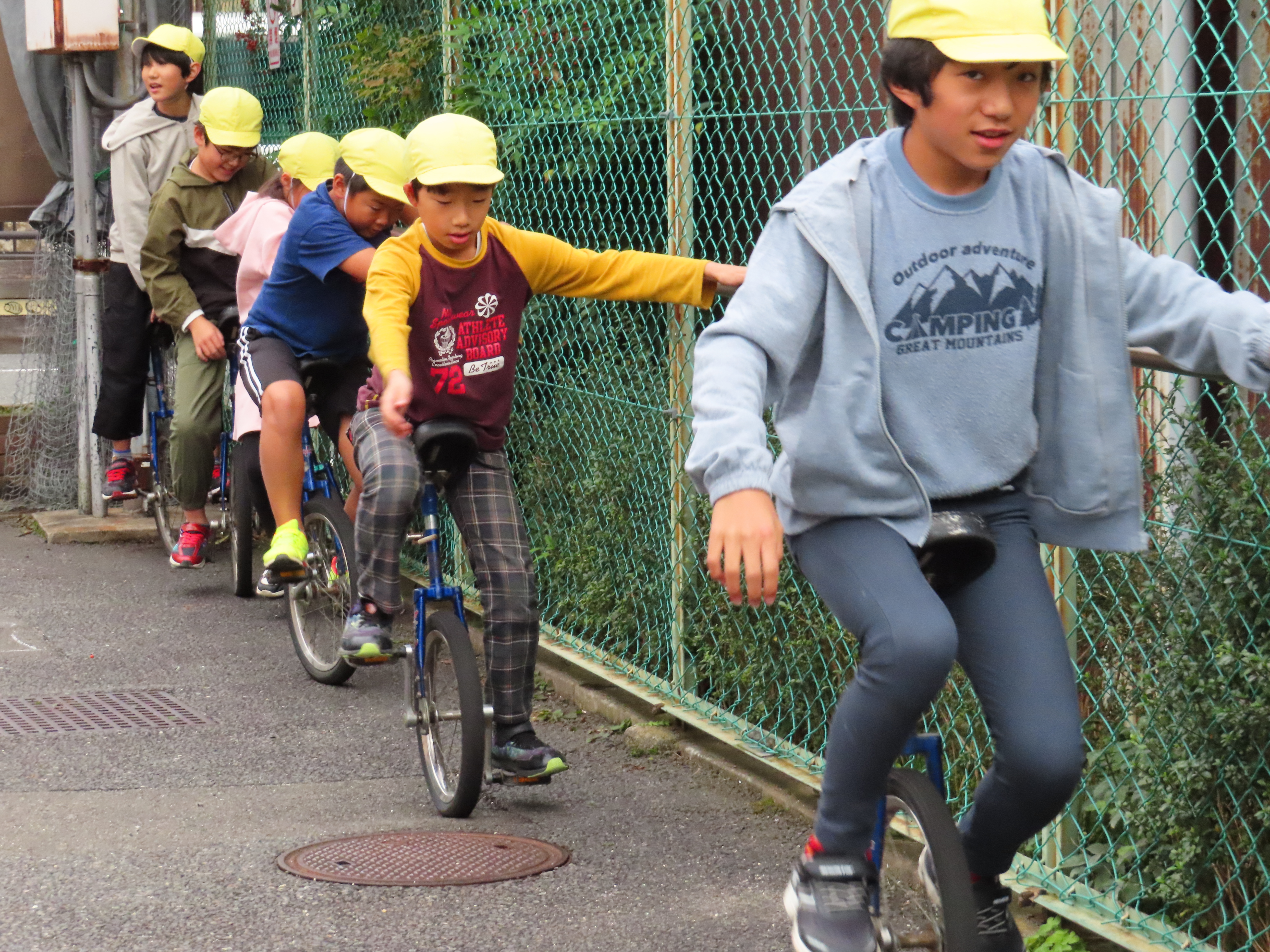 最初は一輪車にまたがるところからはじめ、徐々に横移動の練習へうつります。けがのないよう集中して練習しましょう。