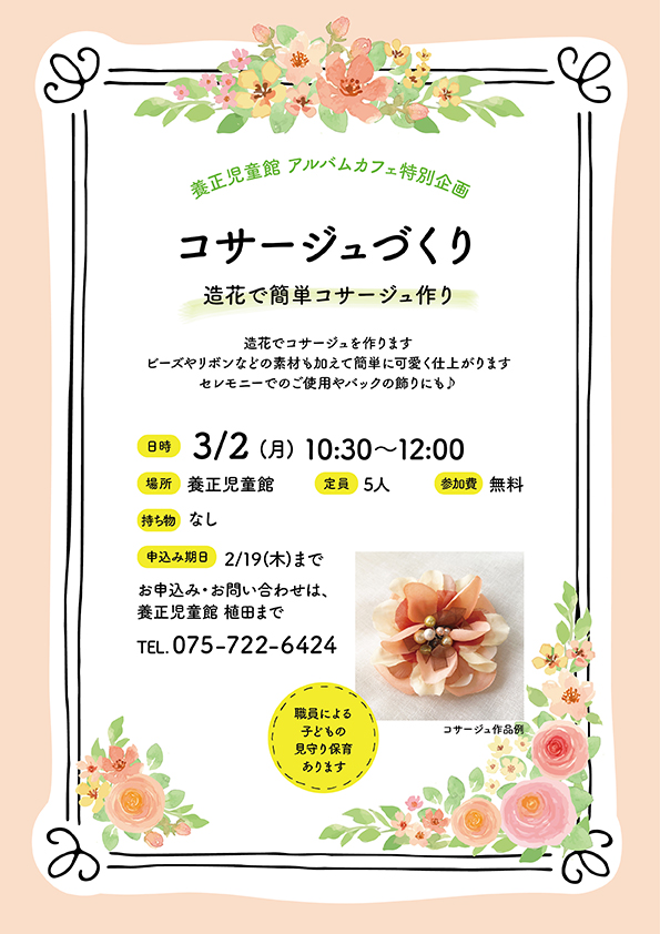 内容ー造花でコサージュを作ります。簡単でかわいく仕上がりますよ!セレモニーでのご使用はもちろん、バッグの飾りにも♪申込み・お問い合わせは児童館まで!
